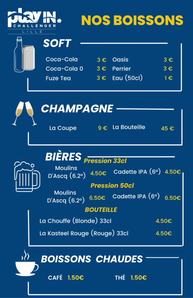 A bit hungry (or thirsty…) ? Need to recover of your emotions between two matches in Play In Challenger ? Our staff and volunteers will be there to serve you throughout the day! Enjoy our map below. Be careful: no food nor drinks accepted in the stands😊.